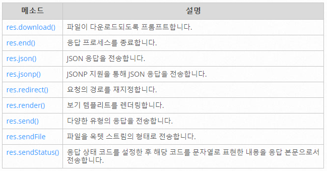 아래 표의 메서드들은 response를 클라이언트로 전송하고 요청-응답 주기를 종료할 수 있게 합니다.